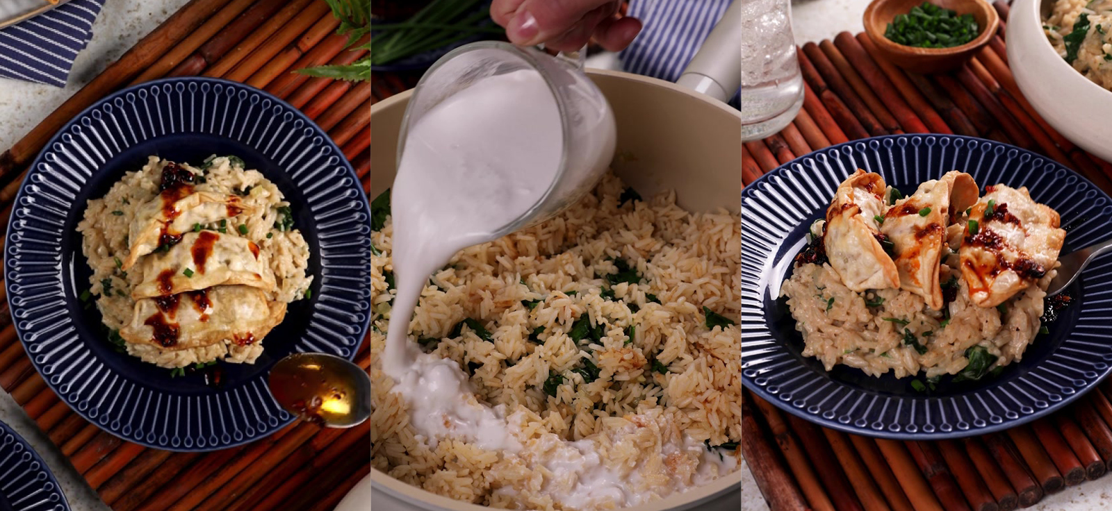 - Divide rice among serving bowls and top with potstickers. Drizzle with hot sauce. Garnish with chives and serve.